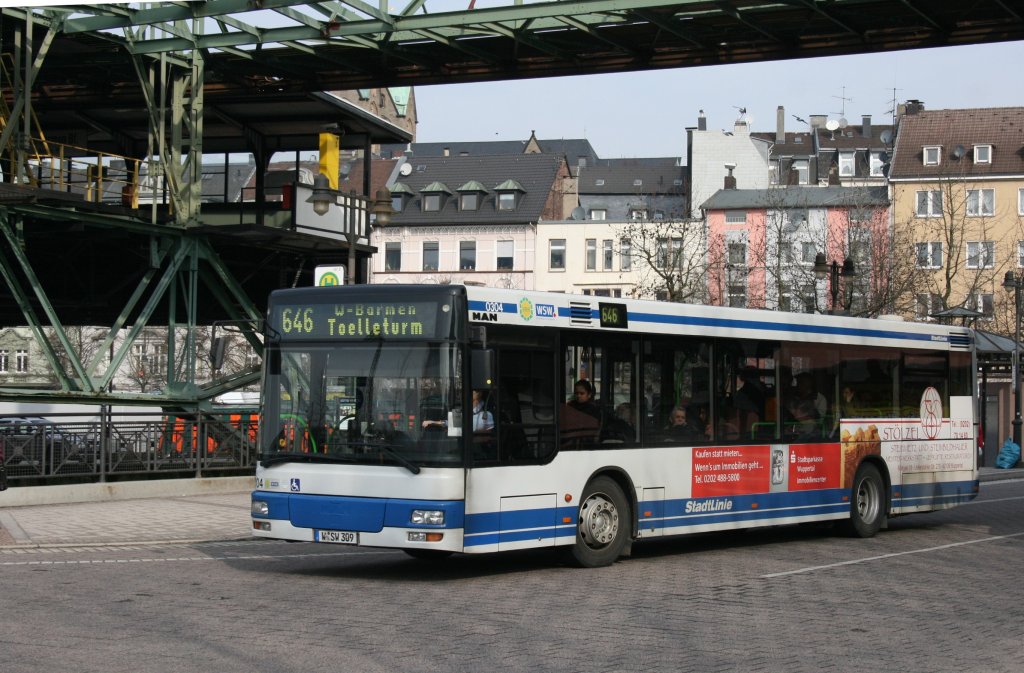 WSW 0309 (W SW 493) mit Werbung für das Bekleidungs Magazin. Aufgenommen am Bahnhof Oberbarmen, 17.3.2010.