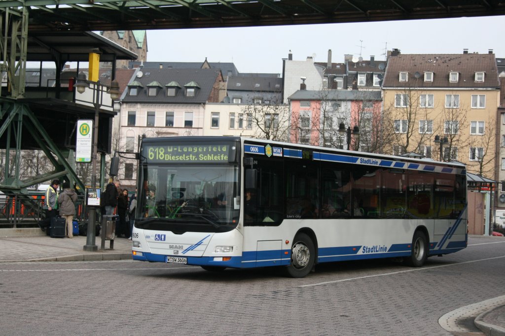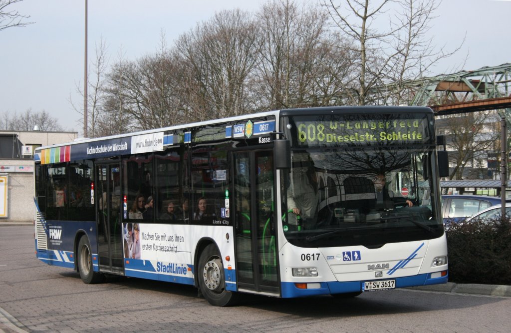 WSW 0617 (W SW 3617) mit Werbung für FHDW. Aufgenommen am Bahnhof Oberbarmen, 17.3.2010.