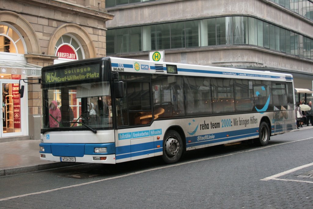 WSW 0106 (W SW 292) mit Werbung für das Reha Team 2000. Aufgenommen am Wall Museum mit der Linie CE64 nach Solingen. 13.3.2010