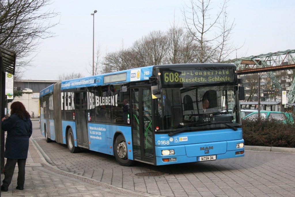 WSW 0168 (W SW 34) mit Werbung für das Ticket 2000. Aufgenommen am Bahnhof Oberbarmen mit der Linie 608. 17.3.2010