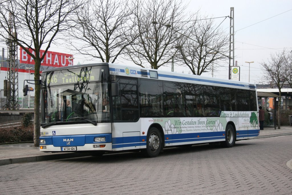 WSW 0306 (W SW 404) mit Werbung für Garten und Landschaftsbau Mike Els. Aufgenommen mit der Linie 646 am Bahnhof Oberbarmen. 17.3.2010