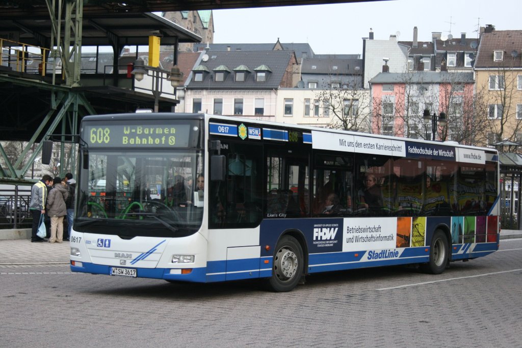 WSW 0617 (W SW 3617) mit Werbung für FHDW. Aufgenommen am Bahnhof Oberbarmen mit der Linie 608. 17.3.2010