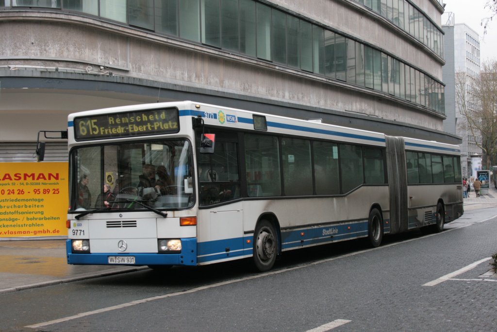 SW Remscheidt 137 (RS VL 37) am Wall Museum mit der Linie 615 nach Remscheidt Markt. Der Wagen macht Werbung für EWR Wärme. 13.3.2010