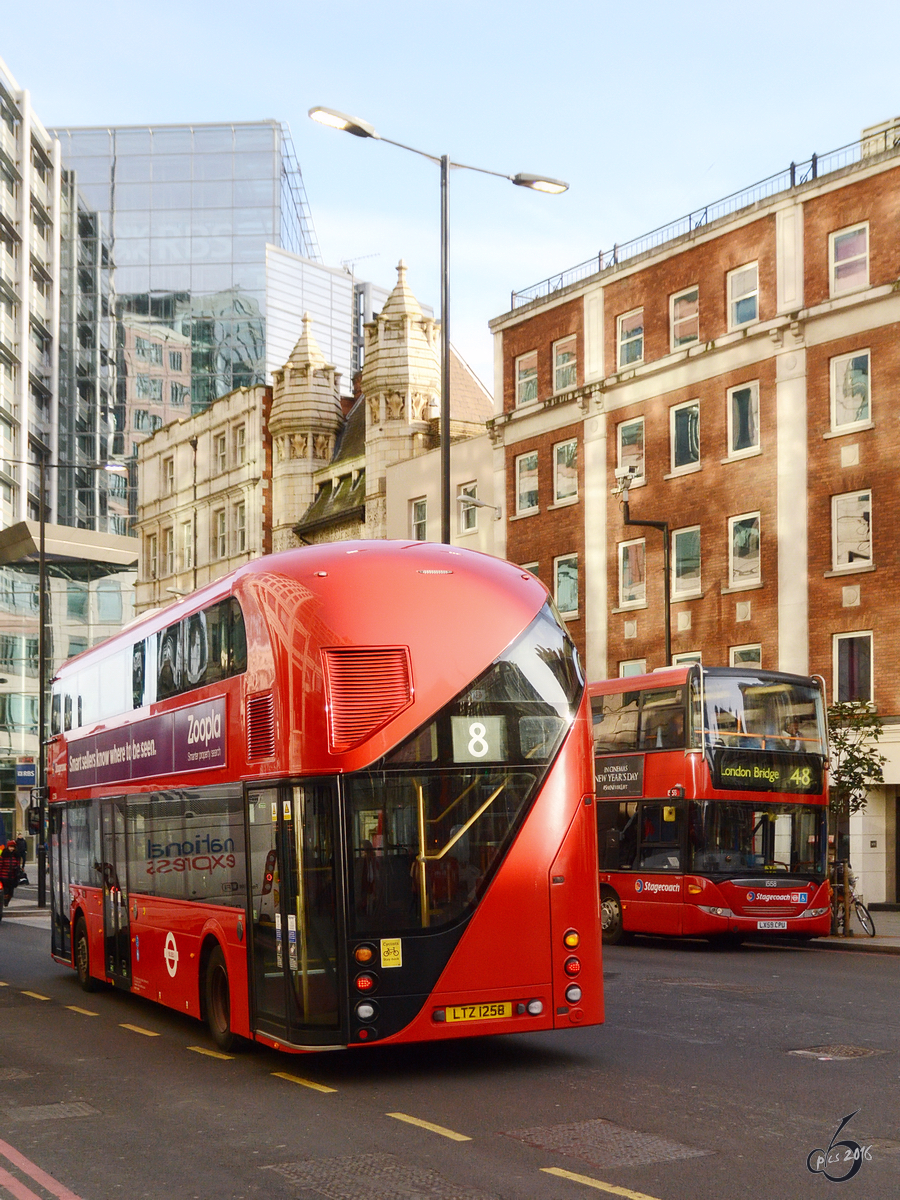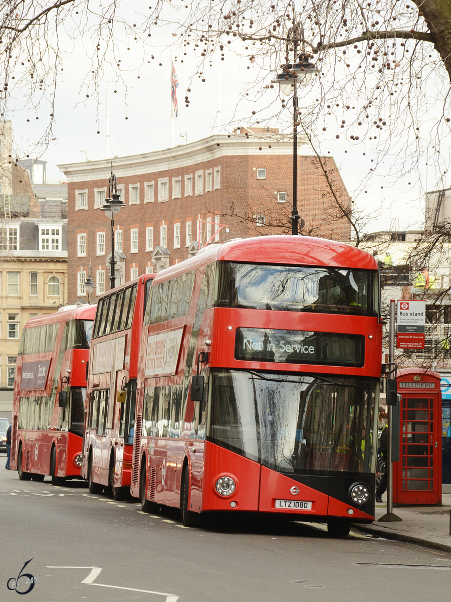 Ein Wright NB4L New Routemaster (LT180) und zwei weitere Stadtbusse im Februar 2015 in London.