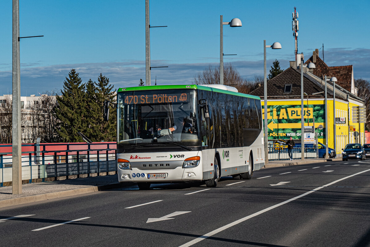 21.2.2024: BD 16157 durchfährt den St. Pöltner Hauptbahnhof als Landhausshuttle 100 zur Staudratgasse. Neben Mödling ist das hier das einzige Einsatzgebiet von Solaris Bussen der Firma Postbus im VOR Tristan Matyus