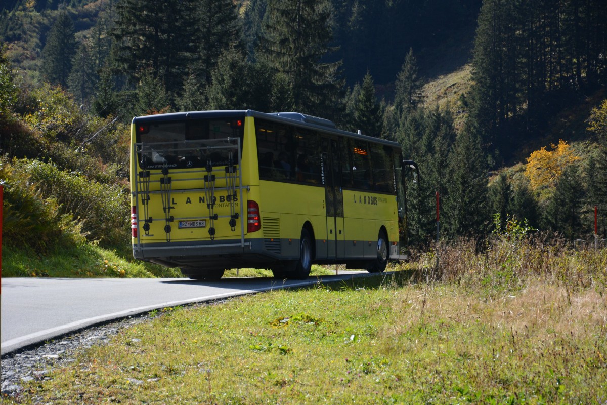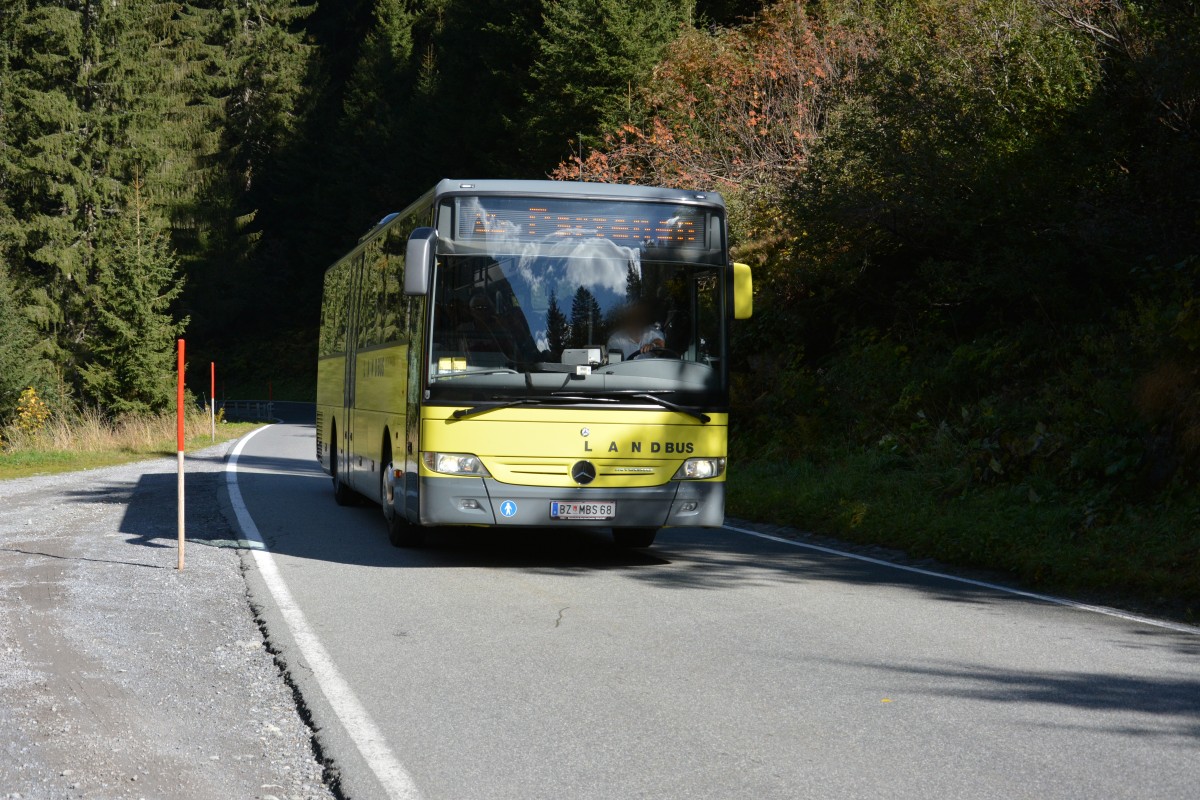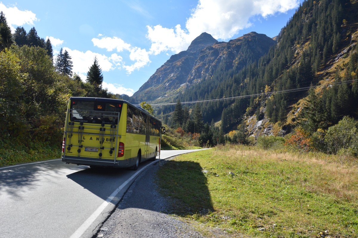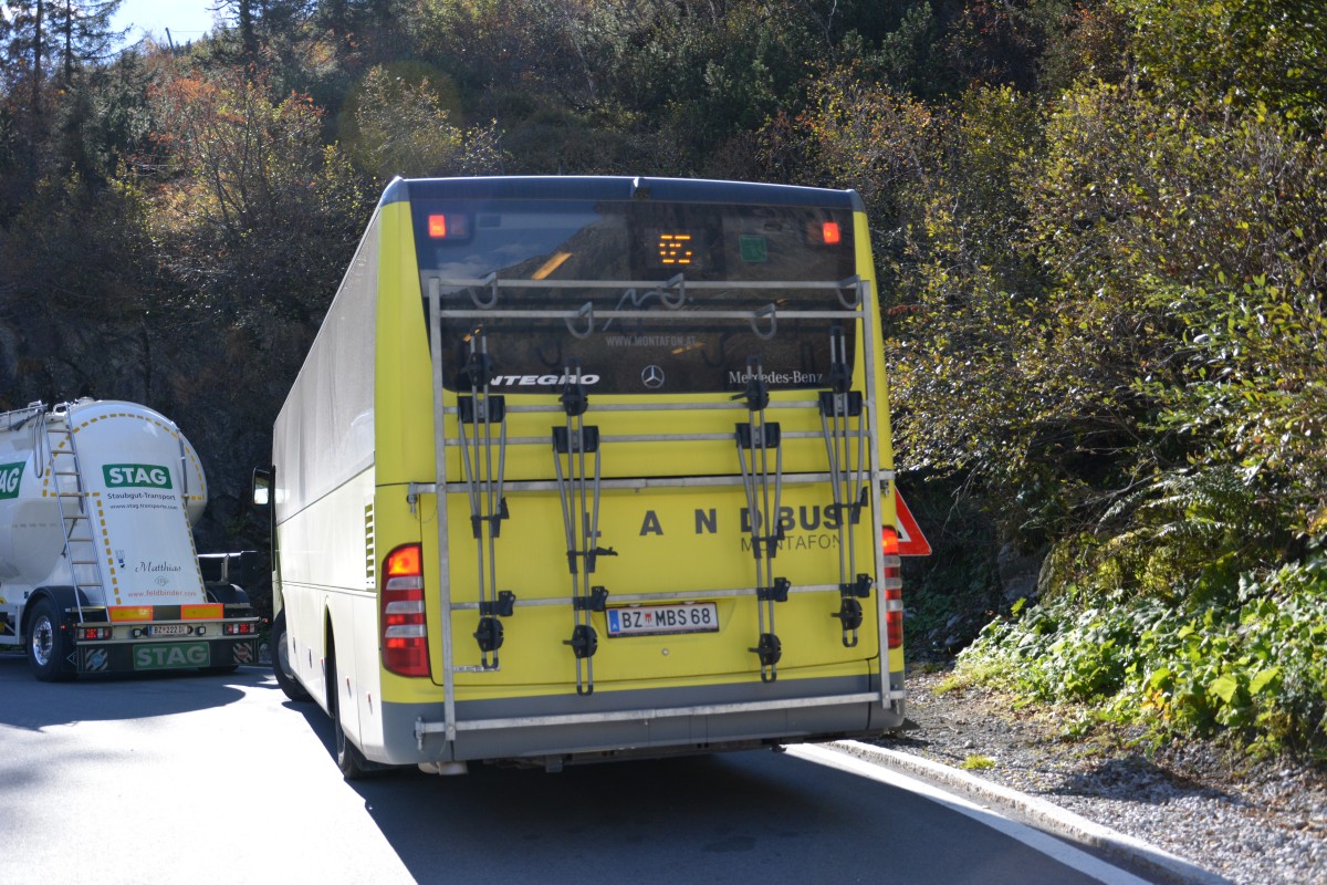 BZ-MBS 68 fährt am 09.10.2015 auf der Silvretta Hochalpenstraße in Richtung Silvretta Stausee, Österreich. Aufgenommen wurde ein Mercedes Benz Integro / Landbus Montafon.