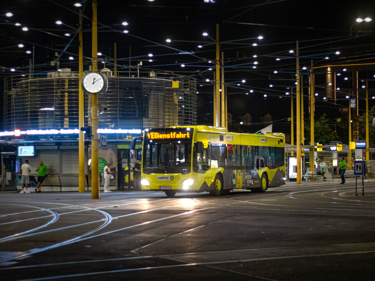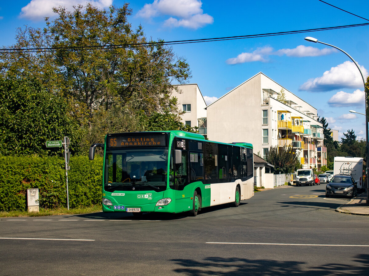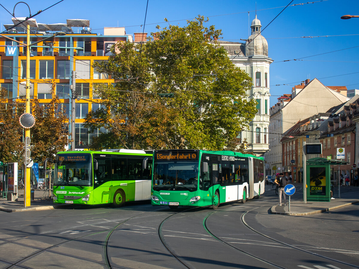 Seiersberg-Pirka. Am 24.05.2025 treffen ein MAN 12C und Mercedes Citaro 2 in der Schleife Seiersberg aufeinander.