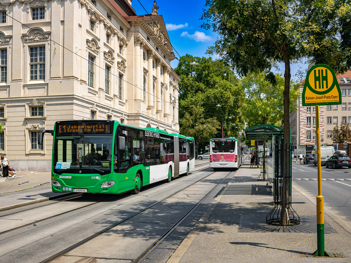 Graz. Vor dem Opernhaus Graz steht am 29.06.2025 ein Citaro 2 der Graz Linien.
