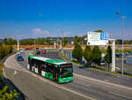 Wien. Während den Sommerferien 2025 ist die meistbefahrene Eisenbahnstrecke für den Personenverkehr in Österreich totalgesperrt. Um die Fahrgastströme auf der "Stammstrecke" in Wien mit Ersatzbussen zu bewältigen, wurden Ersatz-Gelenkbusse unter anderem aus Graz organisiert, die Werkstags im 5 Minuten Takt pendeln. Einer der Busse ist hier am 16.08.2025 auf der Auffahrt zu Donauuferautobahn zu sehen.