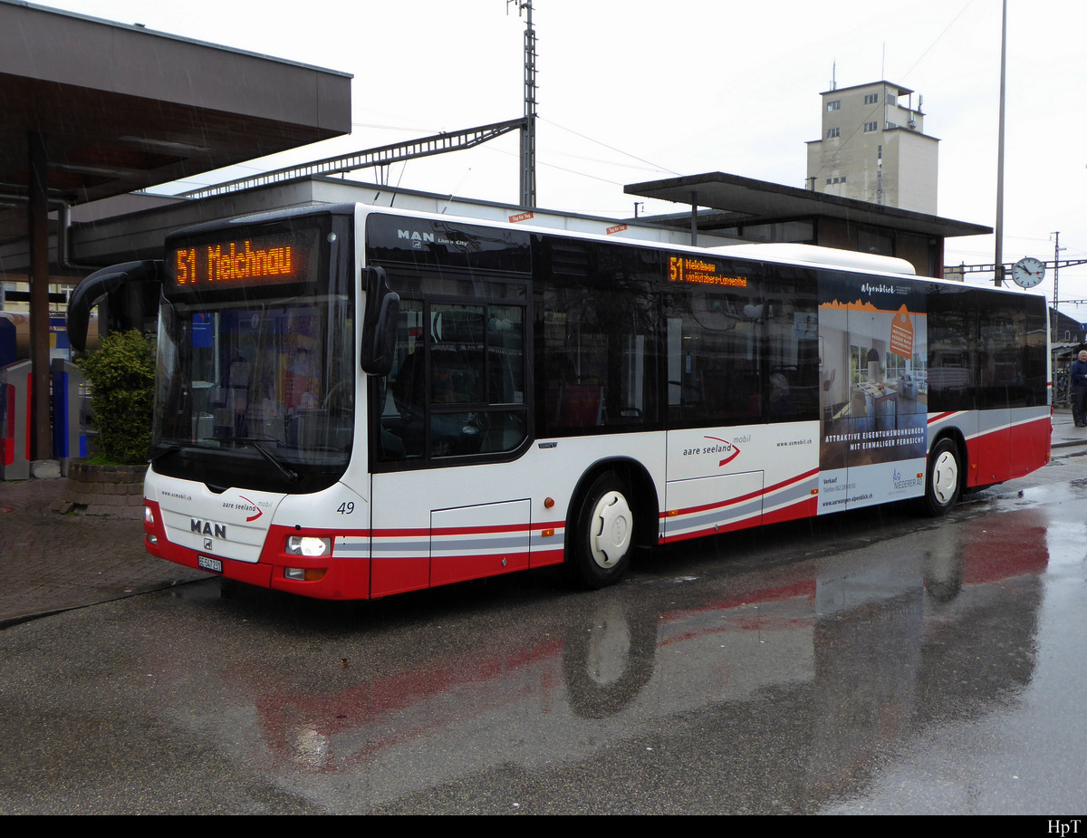 asm Oberaargau - MAN Lion`s City Nr.49 BE 547231 bei Regen vor dem Bahnhof in Herzogenbuchsee am 05.03.2020