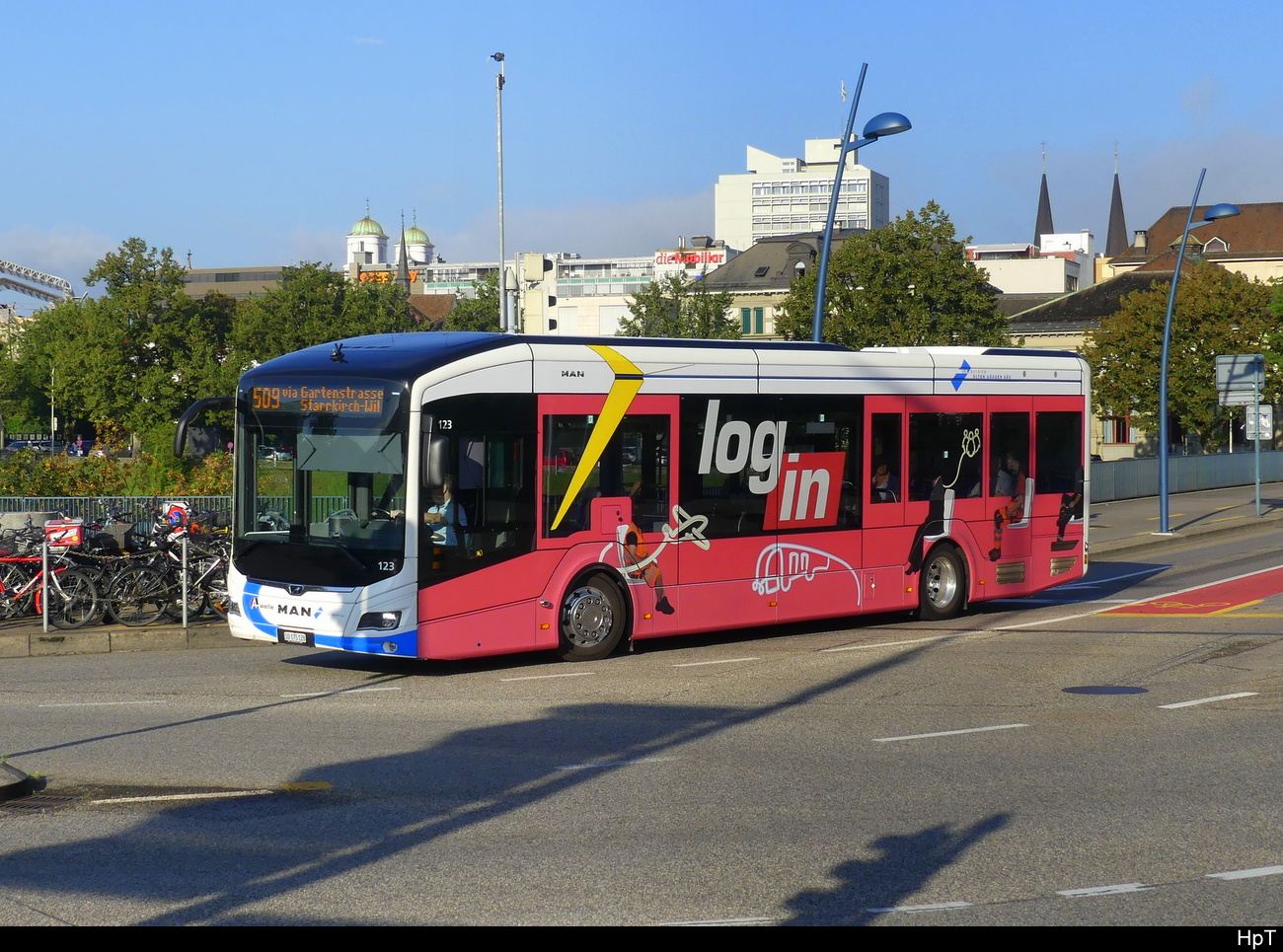 MAN Lions City Elektrobus 121, auf der Linie 509, überquert am 13.06.2024 die Bahnhofbrücke beim Bahnhof Olten.