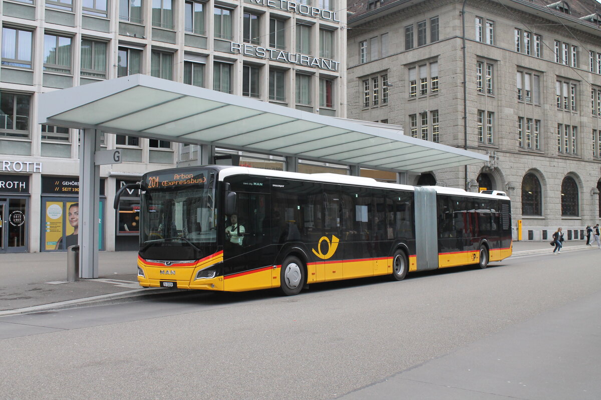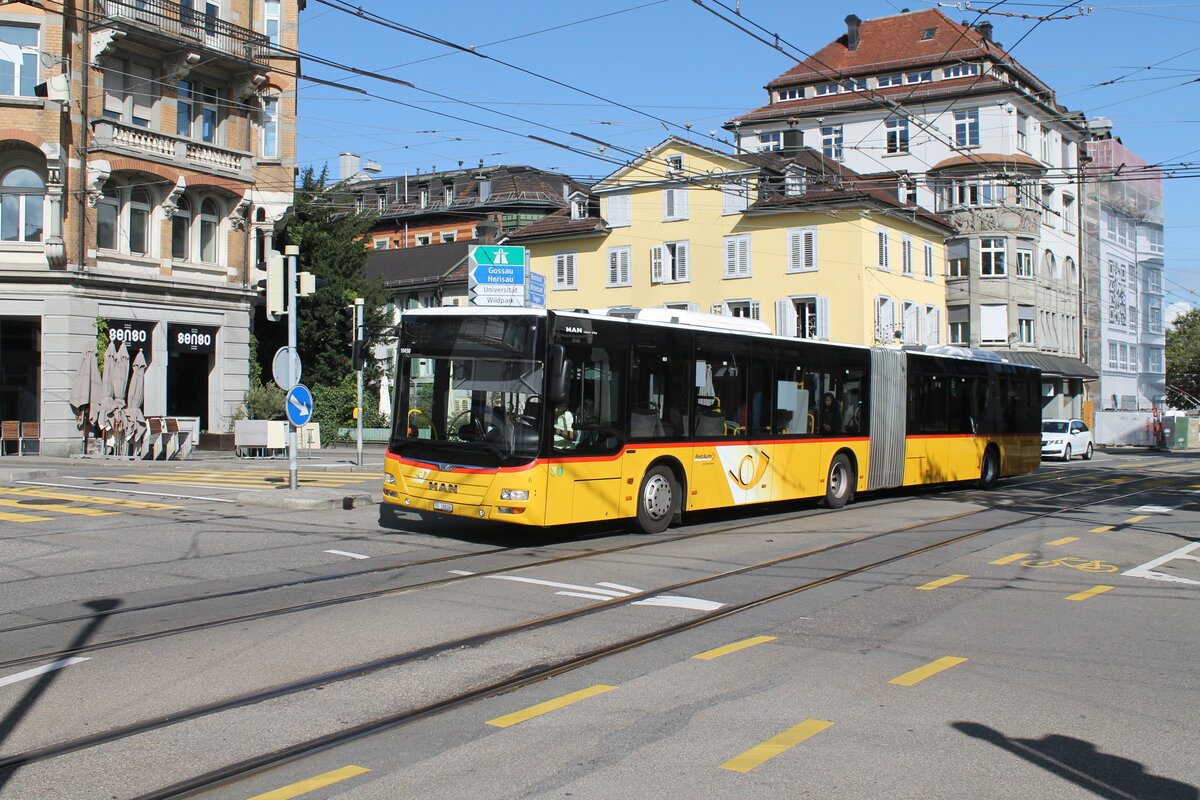 Postauto/PU Eurobus Nr. 16 (Mercedes Citaro C2 O530G) am 28.3.2021 in St.Gallen, Marktplatz. Mit diesem Citaro beschafft Eurobus nach 8 Jahren wieder einen Citaro und erstmals ein 4-türiger Gelenkbus Silvio Jenny