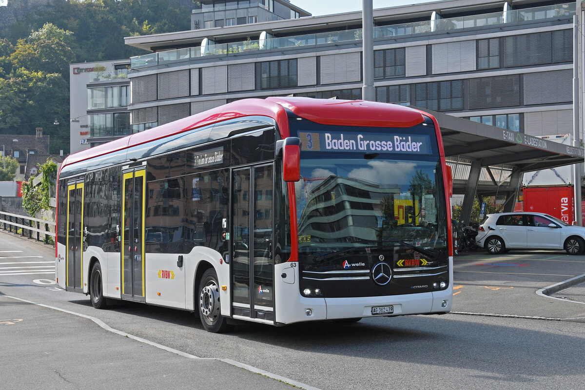 Mercedes eCitaro 62, auf der Linie 3, verlässt am 08.09.2025 die Haltestelle beim Bahnhof Baden.