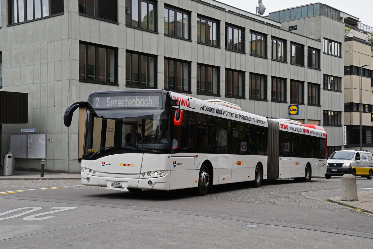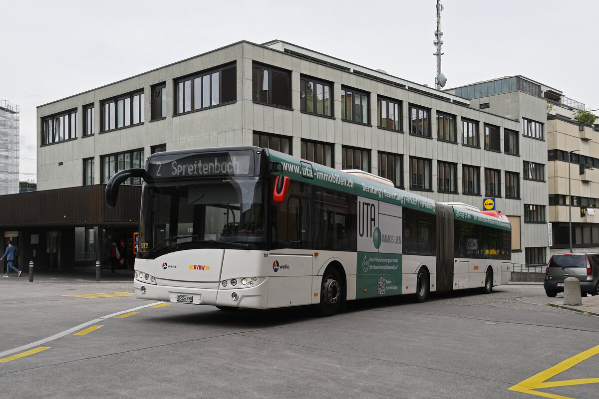 Solaris Bus 181, auf der Linie 2, fährt am 08.09.2025 zur Haltestelle beim Bahnhof Baden.