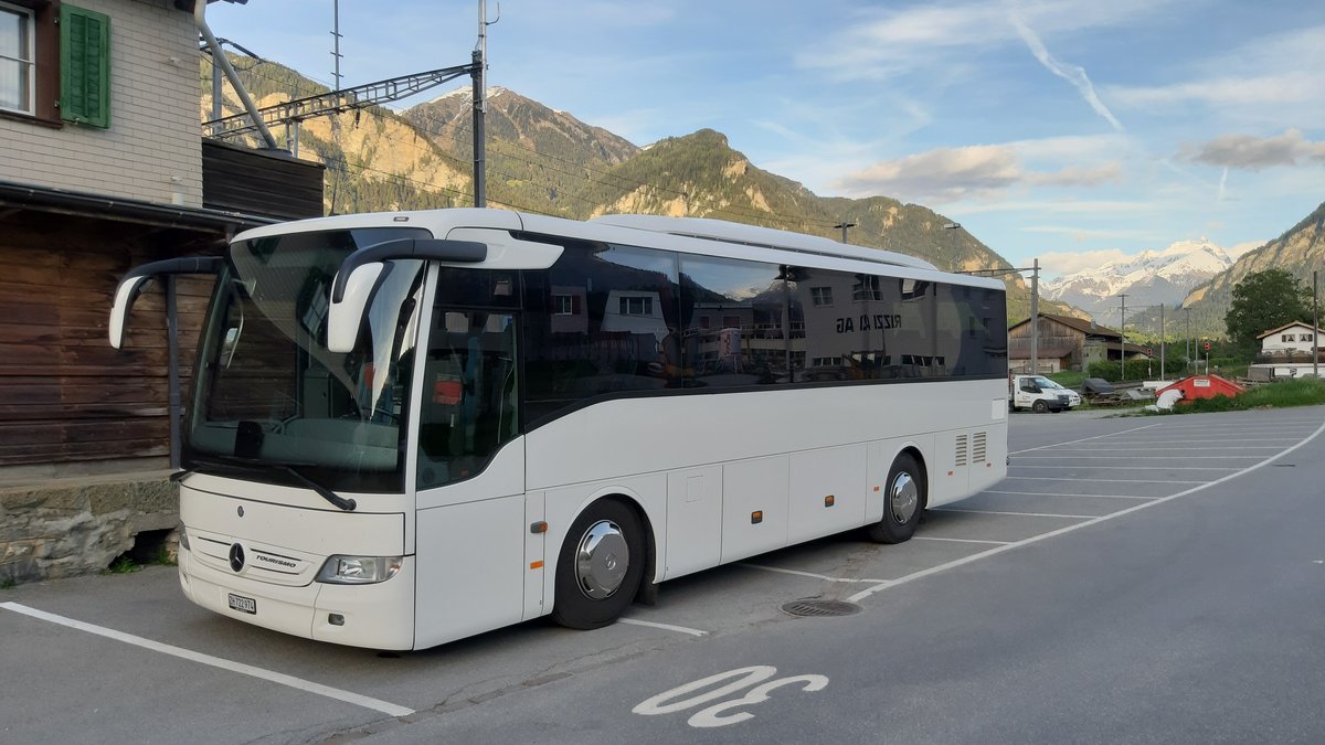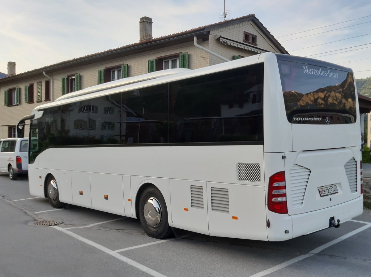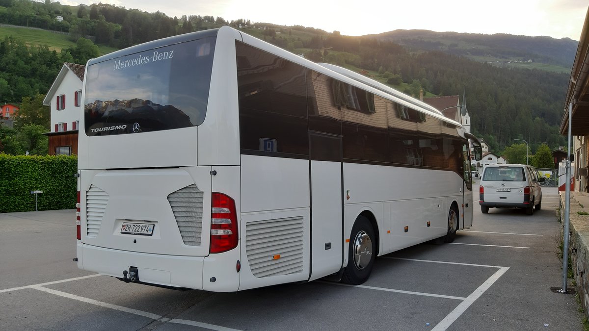 Mercedes-Benz Tourismo, ZH 722974, am Bahnhof Cazis, ein Fahrzeug der Evo-Bus unterwegs im Auftrag von Schneider Reisen und Transport AG, Langendorf, Aufgenommen am 1. Juni 2019