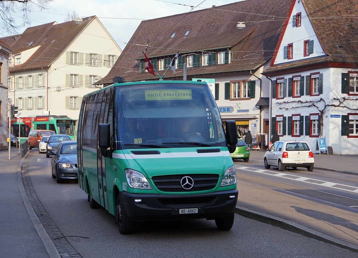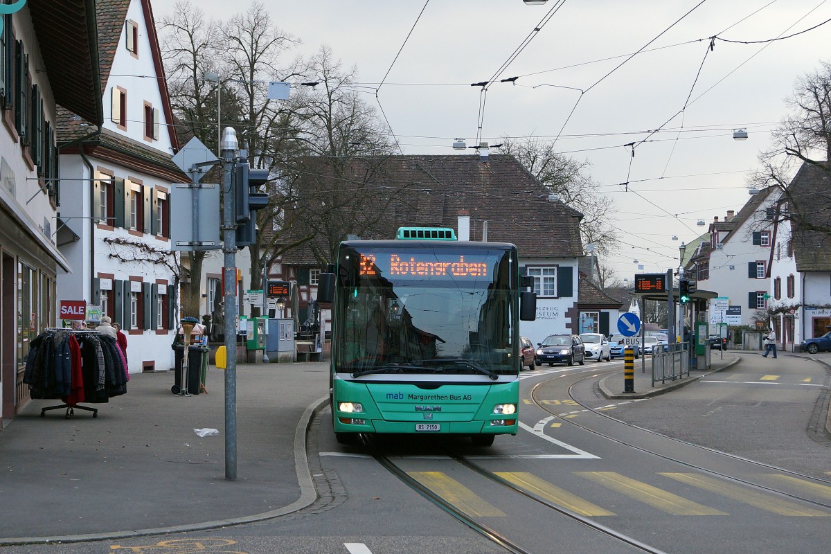 BVB-Kleinbusse: MAN der mab Margareten Bus AG auf der Linie 32 Gemeindespital-Steingrubenweg-Rotengraben. Die Aufnahme ist am 6. Februar 2015 in Riehen-Dorf entstanten.