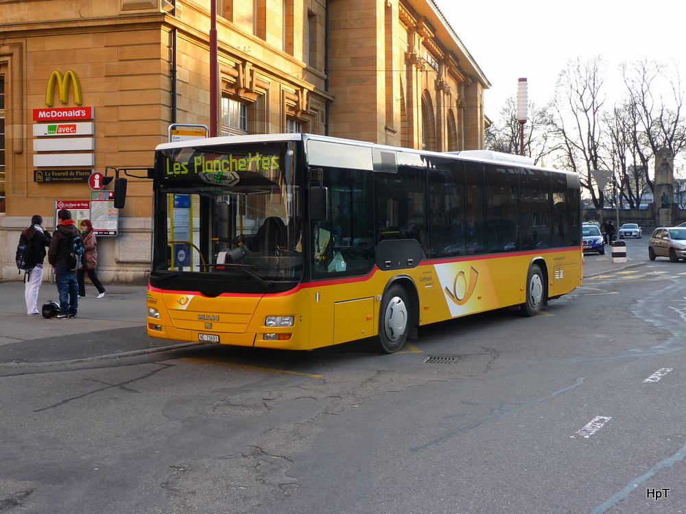 trn La Chaux de Fonds - Solaris Trolleybus Nr.123 unterwegs auf der Linie 4 beim Bahnhof von La Chaux de Fonds im Abendlicht am 22.03.2011 Hp. Teutschmann