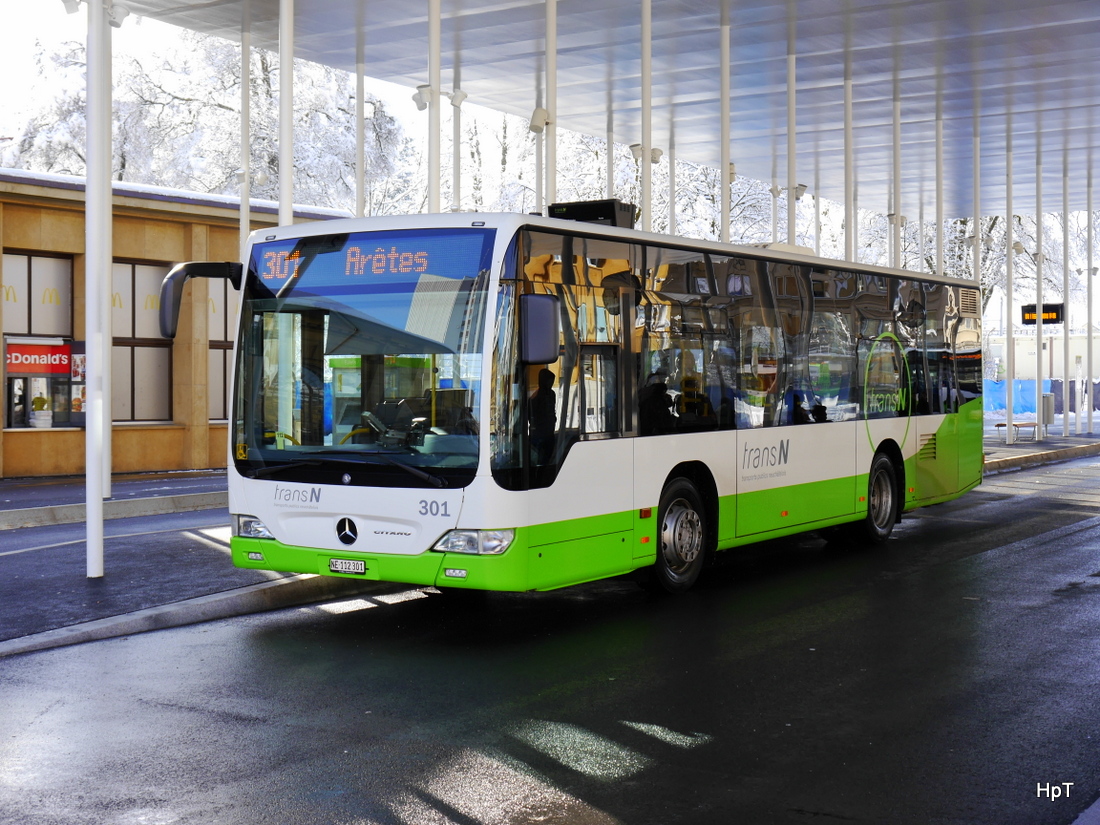 TransN - Mercedes Citaro  Nr.301  NE 112301 unterwegs auf der Linie 301 bei den Neuen Bushaltestellen vor dem Bahnhof in La Chaux de Fonds am 18.01.2015