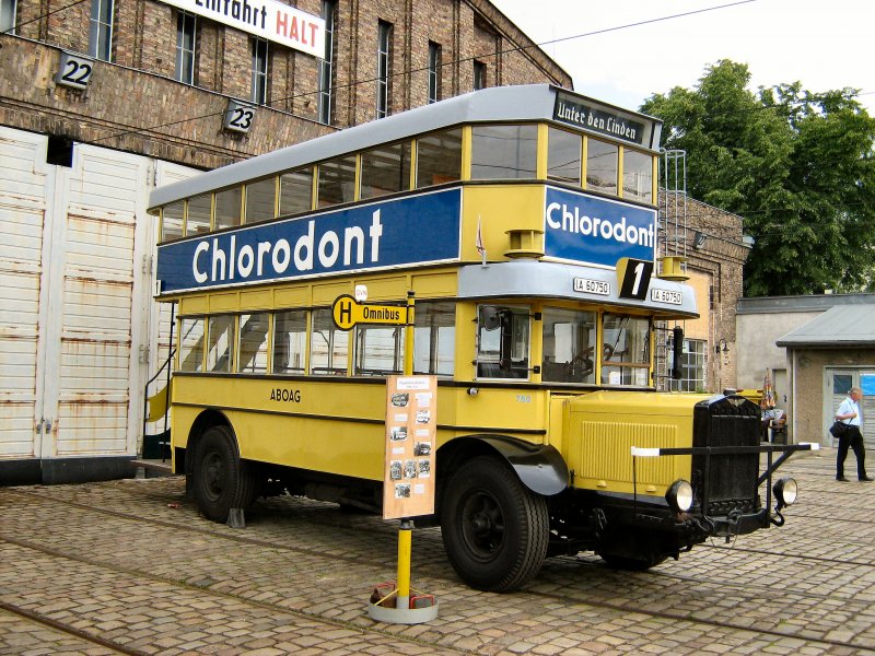 Hist. Doppeldeckerbus mit Reklame Möbel-Hübner an der Hst. Monumentenhalle, Sonderverkehr September 2007