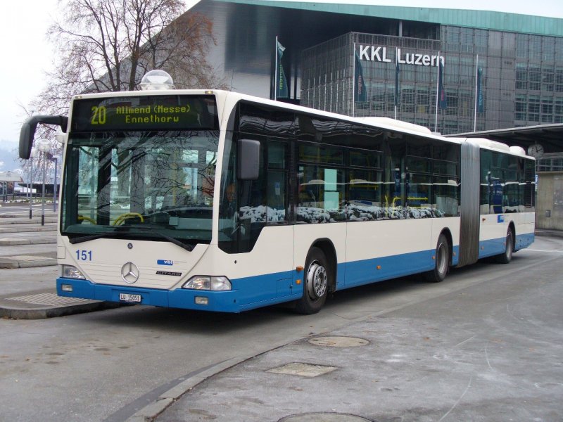 VBL - Der Mercedes Citaro Gelenk-Bus Nr.151 LU 15051 bei der Haltestelle vor dem Bahnhof Luzern am 18.11.2007