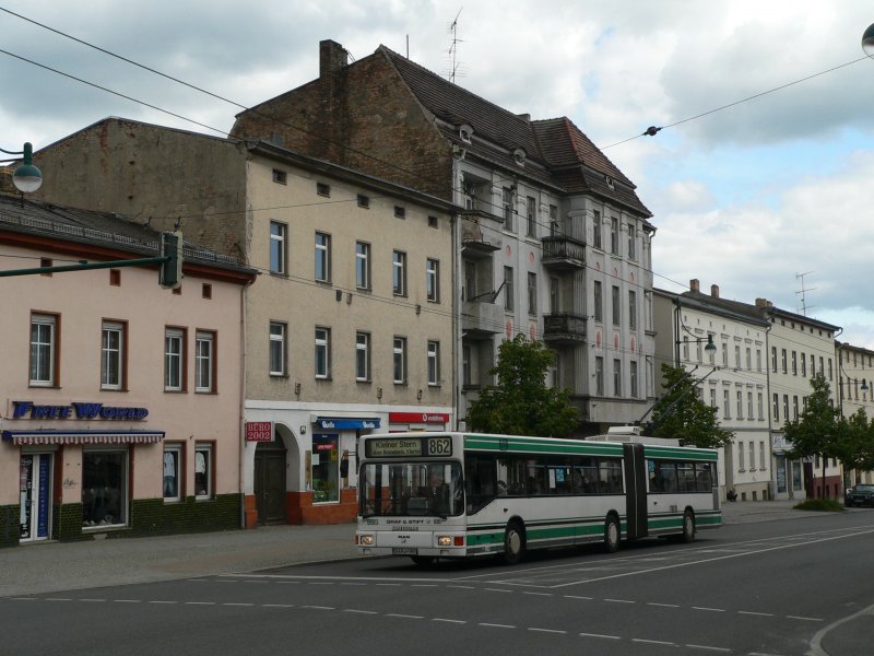 Obus in der Seitenansicht, Breite Straße Ecke Friedrich-Ebert-Straße in Eberswalde. 17.5.2007
