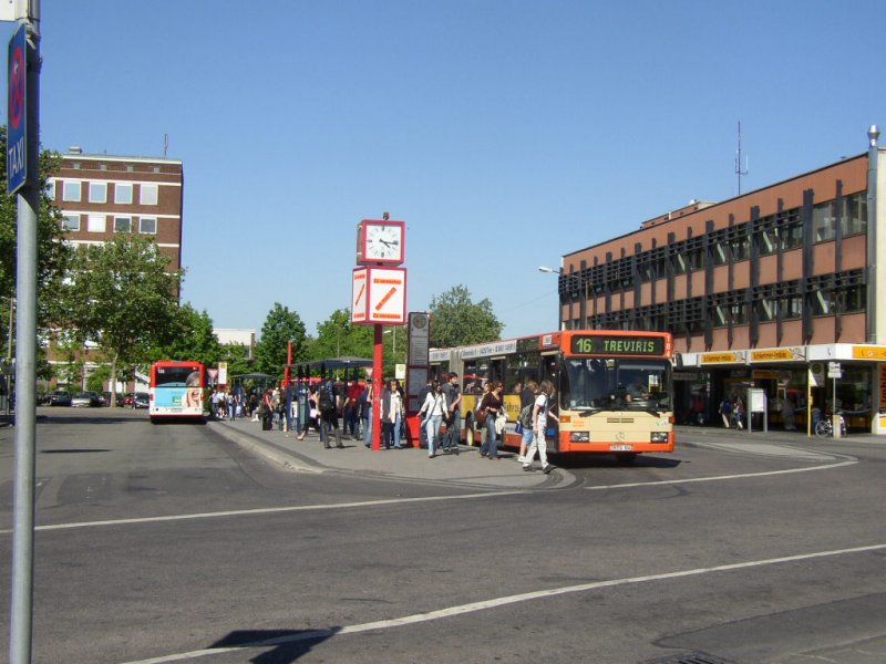 Die Uni-Linie 16 (Universität - Hauptbahnhof - Treveris) wartet zu Weiterfahrt. Sie steht hier an der Haltestelle " Trier Hauptbahnhof ".