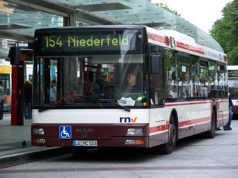 Dieser MAN NL 313 steht gerade am Berliner Platz in Ludwigshafen - dem zentralen Punkt für den ÖPNV in Ludwigshafen.