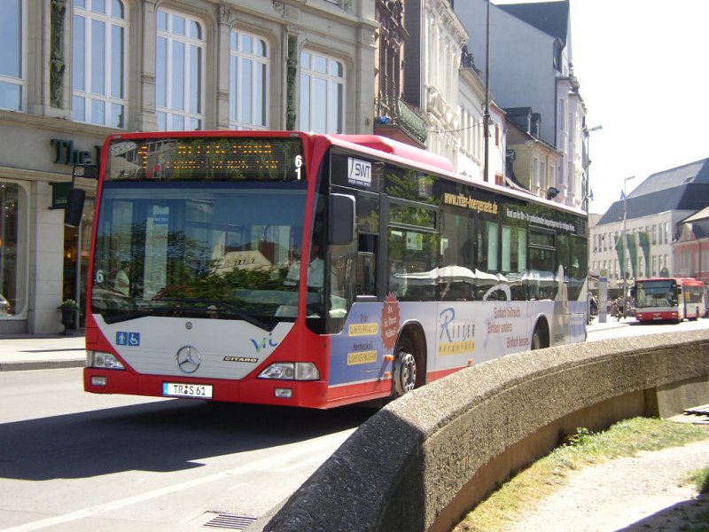 Linie 5 (Feyen - Balduinsbrunnen / Hbf - Treveris - Castelforte) steht gerade an der Ampel um als nächstes die Haltestelle " Porta Nigra " anzufahren.