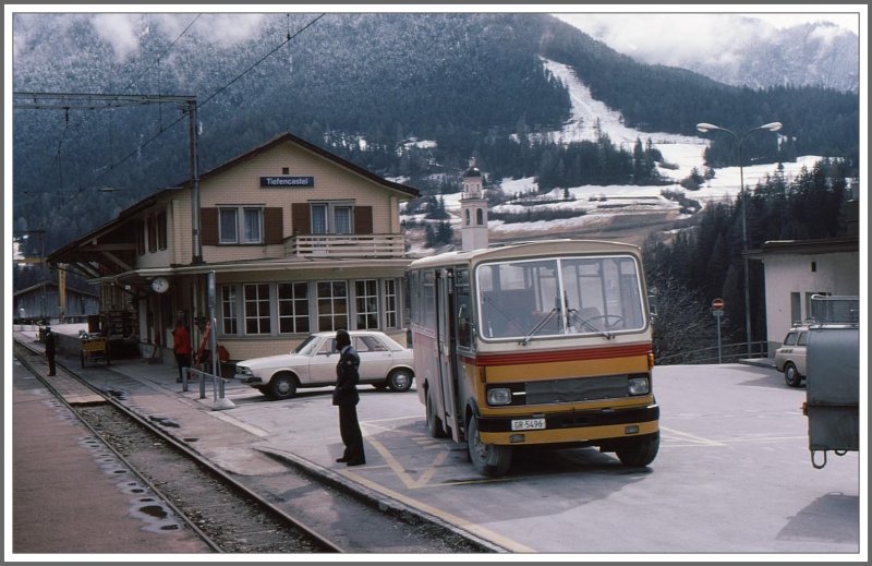 Mercedes Postauto nach Stierva wartet in Tiefencastel auf Anschlussreisende von der Rhätischen Bahn. (Archiv 03/77)