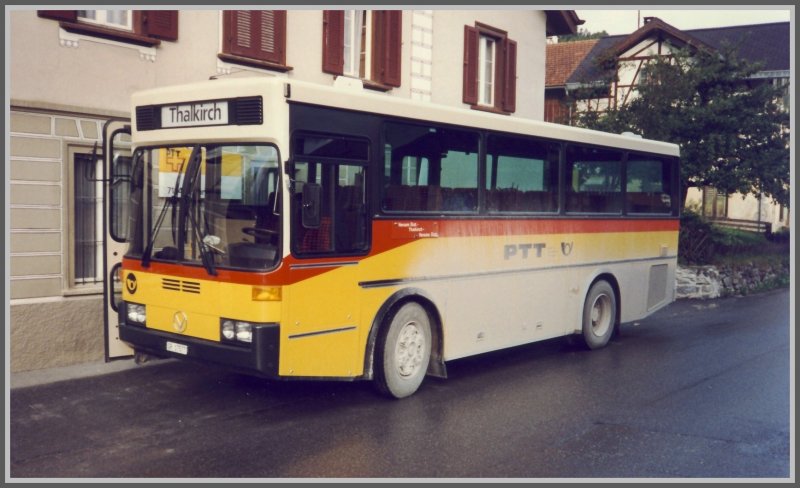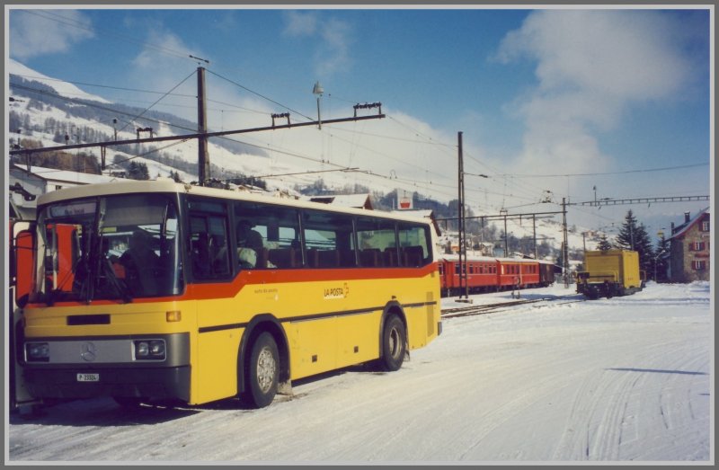 Mercedes Postauto wartet in Scuol/Tarasp auf Bahngäste, die den Weg ins Dorf mit dem Bus zurücklegen wollen. (Archiv 12/99)