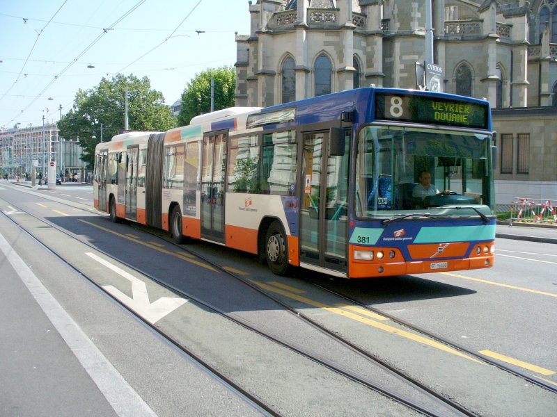 TG - Volvo Gelenkbus Nr. 381 eingeteillt auf der Linie 8 nach VEYRIER DOUANE in den Strassen von Genf ( Genève )am 06.05.2007
