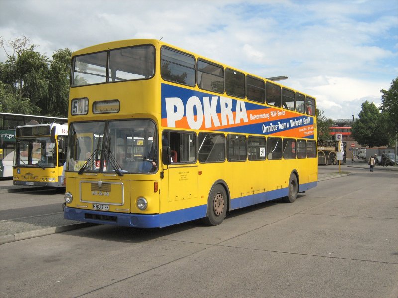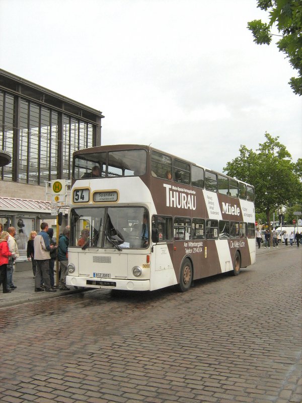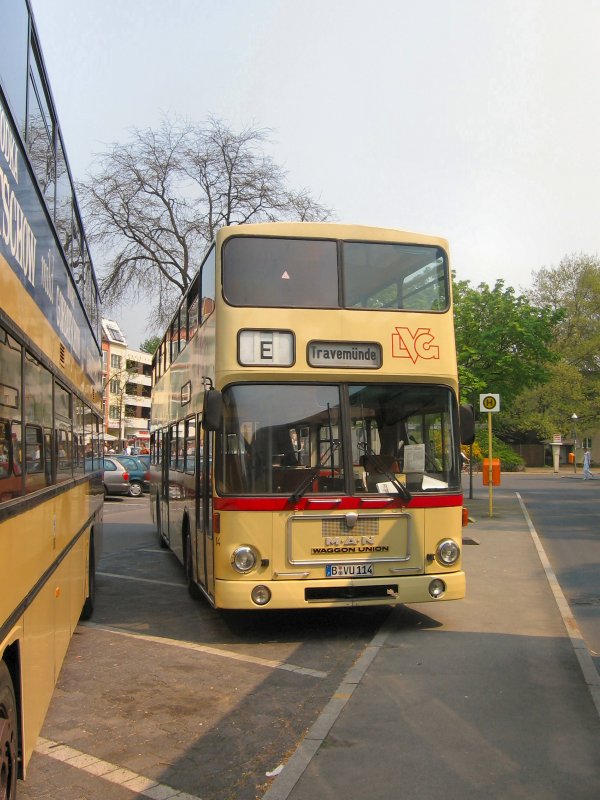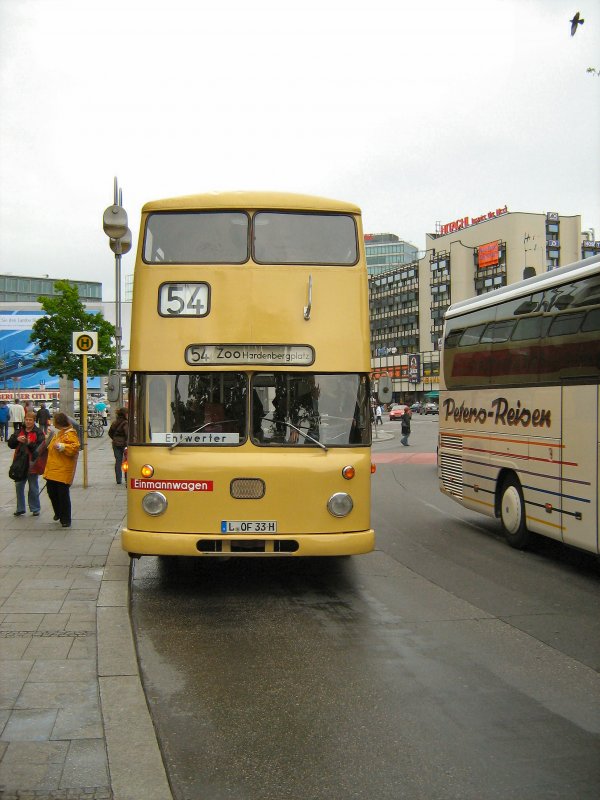 Hist. MAN-Doppeldecker vor neuer Fahrt nach Spandau an Bhst. Bhf. Zoo, Mai 2007