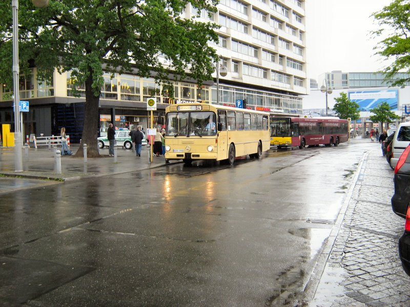 Hist. Stadtbus vor Niederflurbus im strömenden Regen am Ausstieg Bahnhof Zoo, Mai 2007