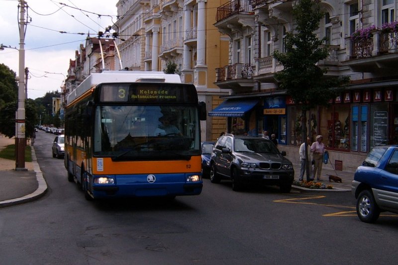 Skoda-Irisbus 24Tr #52 (ursprünglich war der Wagen für Zlin in Skoda bestellt, aber nach einem Bahnunfall hat der Maschinenraum im Heck ausgebrannt und der Wagen war umgebaut und nach Marienbad verkauft) fährt die Hlavni-Str. hinauf, 4. 8. 2006.
