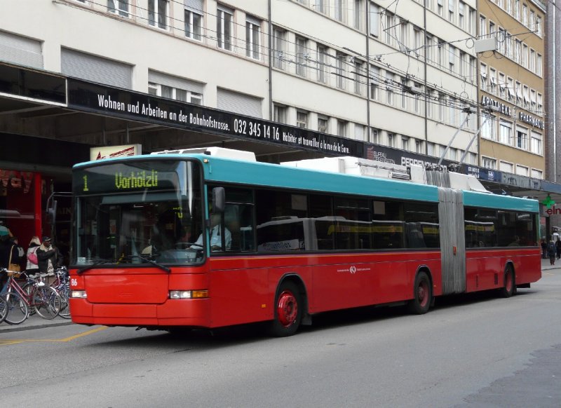 VB-Biel - NAW Gelenk Trolleybus Nr 86 eingeteilt auf der Linie 1 nach VORHOELZLI in den Strassen von Biel am 19.10.2007