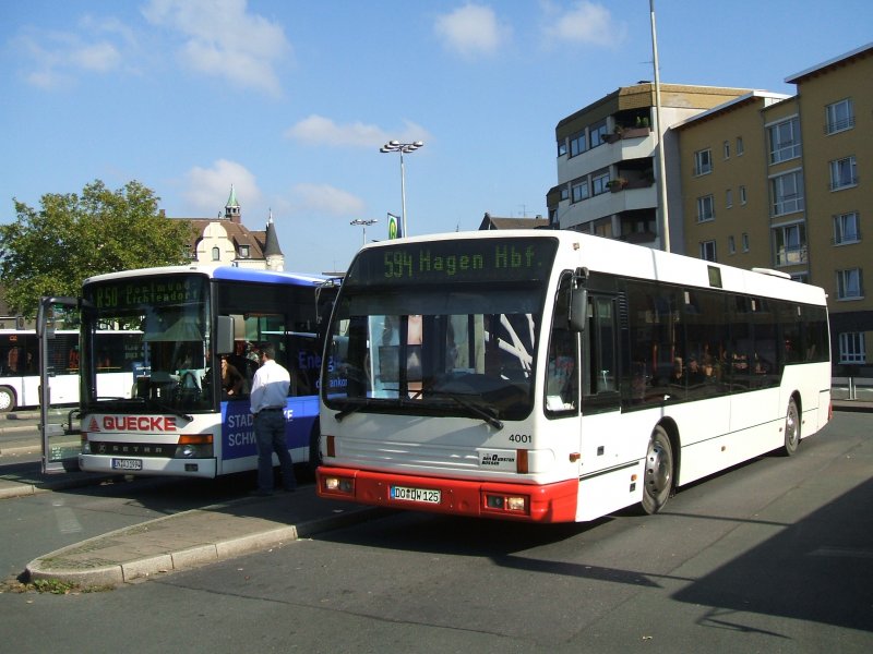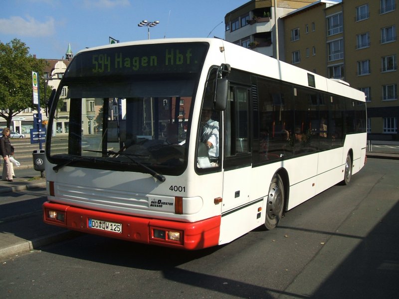 Der Linienbus 594 nach Hagen des BVR ,Bustyp "DEN OUDSTEN BUSSEN" Seriennummer 4001 im Schwerter Busbahnhof