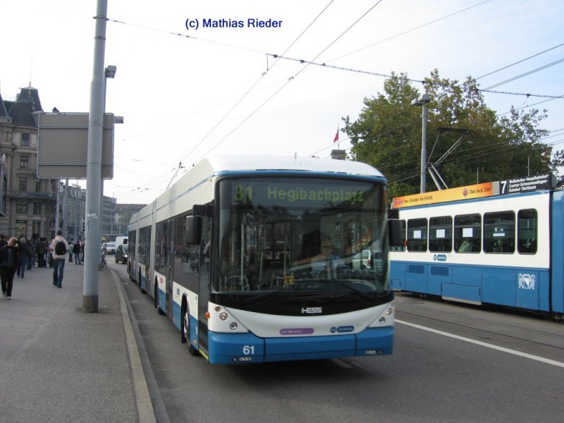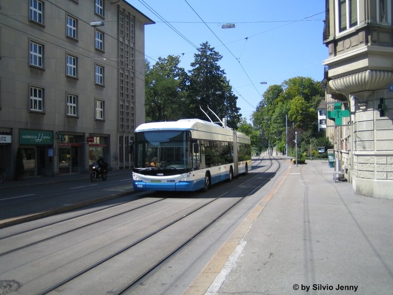 Swisstrolley 150 am 26.8.07 auf der Linie 31 Richtung HEgibachplatz am Kreuzplatz. Obwohl dieses Fahrzeug dazumal noch nicht mit dem neune Leitsystem ausgerüstet war, blieb die Zielanzeige dunkel, was bei manueller Einstellung nicht passieren sollte.