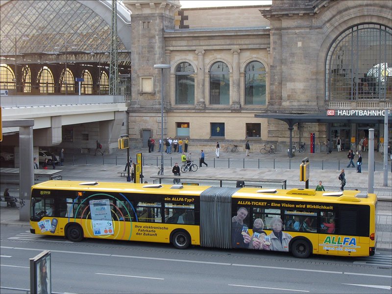 Ein Gelenkbus mit Werbung für das ALLFA-TICKET - Eine Vision wird Wirklichkeit, Ihre elektronische Fahrkarte der Zukunft; am Hauptbahnhof Dresden, 1.10.2007