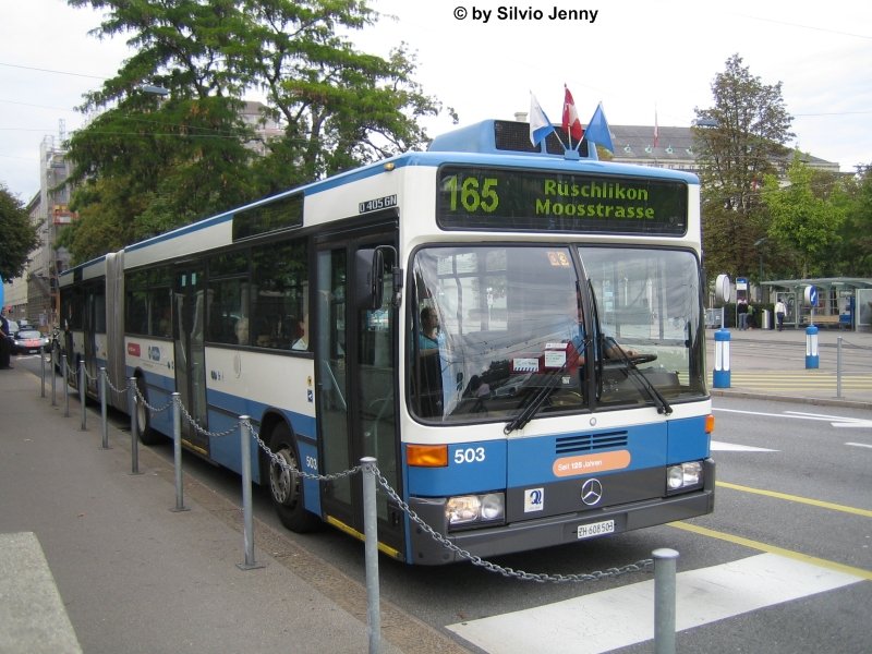 MErcedes O405GN Nr. 503 am 9.9.07 beim Bürkliplatz. DIeser Bus ist mit Kasse Überlandtauglich und dank der Videoüberwachung wird er sehr oft auf den Nachtbuslinien eingesetzt. Die Ausrüstung der Busse mit Videoüberwachung war gemäss dem Datenschützer sehr umstritten, nun konnte aber eine Einigung gefunden werden, so dass v.a. Sachbeschädigungen in den Fahrzeugen während des Nachtbuseinsatzes verringert werden konnten.