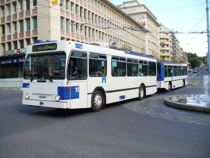 tl - NAW Trolleybus Nr.763 mit Anhänger unterwegs auf der Durchgangsstrasse vor dem SBB Bahnhof in Lausanne am 09.09.2007