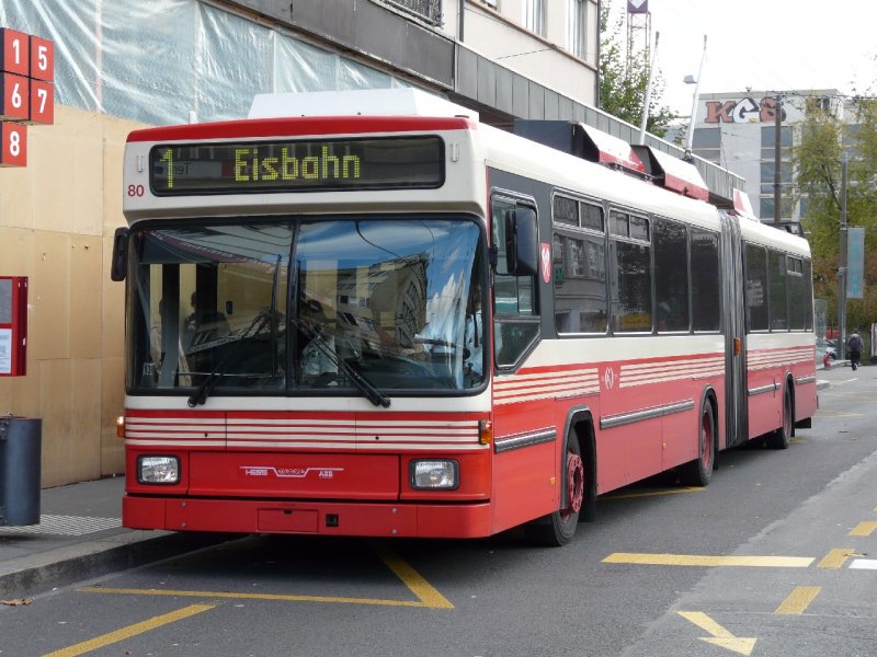 VB Biel - Hess Trolleybus Nr.80 bei der Trolleybushaltestelle gegenüber dem Bahnhof von Biel/Bienne am 19.10.2007