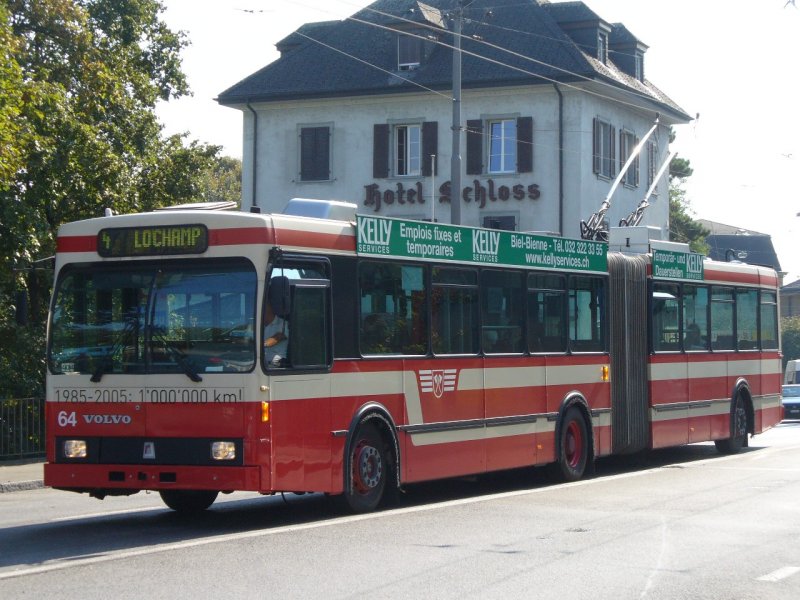 VB - Trolleybus Nr 64 mit Aufschrift auf Front 1985 - 2005 1000000 Km unterwegs zwischen Nidau und Biel am 13.09.2007
