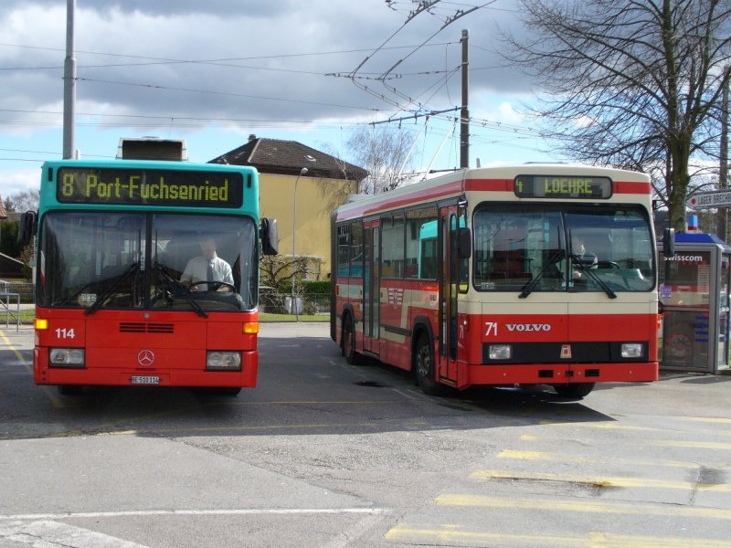 VB - Trolleybus Nr. 71 an der Endstation in Nidau eingeteilt auf der Linie 4 nach LOEHRE neben dem Mercedes Citaro Nr.114 eingeteillt auf der Linie 8 FUCHSENRIED via Port am 03.03.2007