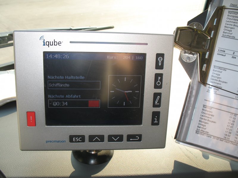 Bord Computer mit GPS und GSM Steuert alle Anzeigen Aussen und Innen fahgastinfo, Haltestellen Ansage und ist auch für den Funk zuständig. Noch nicht alle Autobusse sind Umgebebaut und haben das neue System. TB sind alle umgebaut, Wie hier der 153 kommen alle neuen Busse mit dem System.