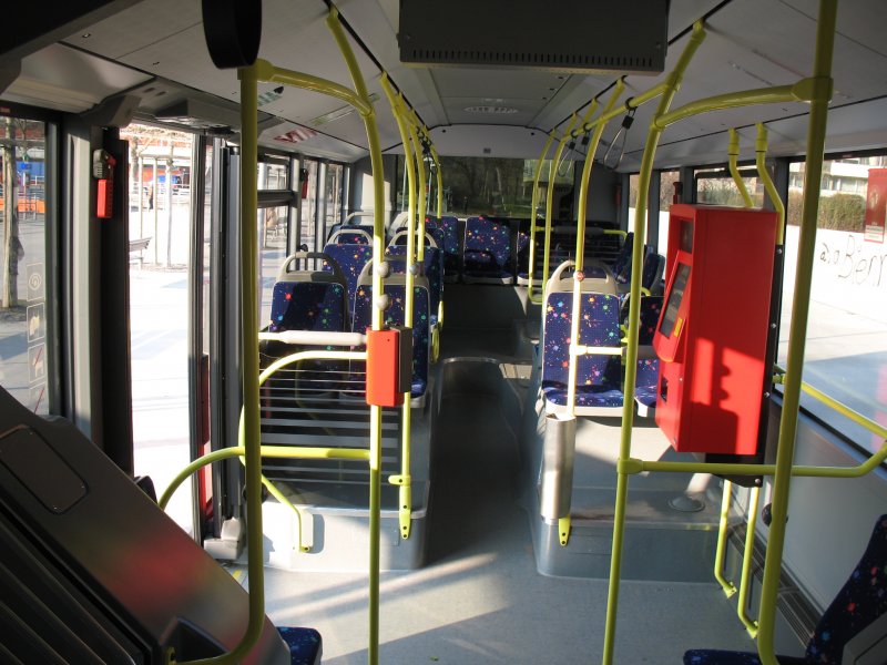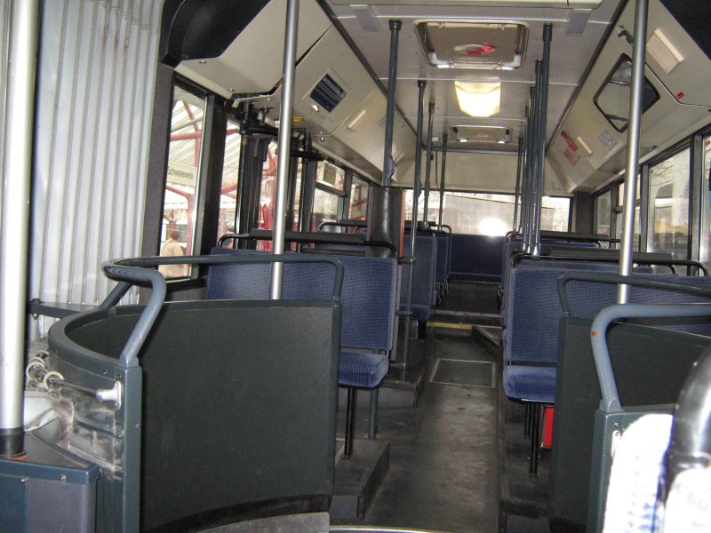 Der Nachläufer des Wagen 4877 von innen, diese Neoplan N4021 Baujahr 1995 werden allmälich alle durch die Neuen Solaris Urbino 18 ersetzt. Wobei die Neos den besseren Fahrkomfort aufweisen als die Urbino von Solaris. Ausserdem haben die Solaris keinen Linienverlaufs Anzeiger wie die alten Busse.