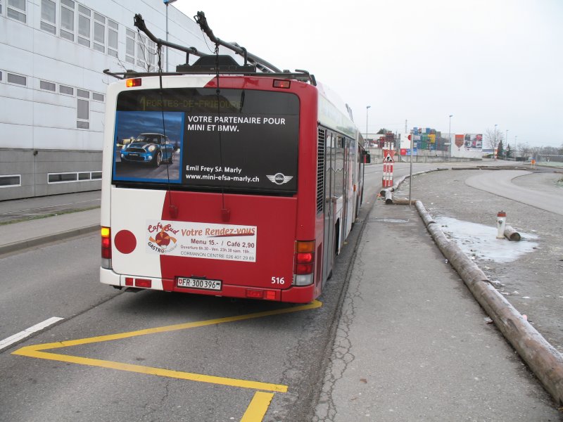 Neoman/Hess Nr. 514 verlässt am 23.12.08 die Haltestelle St.Pierre. Wegen einer Baustelle müssen alle Duobusse ab dieser Haltestelle abbügeln und mit dem Dieselmotor zum Bahnhof fahren.