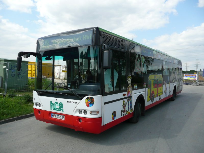 19.05.08,Neoplan der HCR in Wanne-Eickel.Werbung:Die Busschule der HCR.