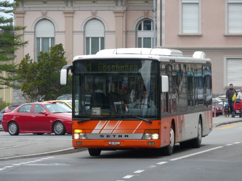 Auto AG Uri - Setra Bus Nr.51 UR 9311 eingeteilt auf der Linie 1 nach Göschene bei der zufahrt zu der Haltestelle vor dem Bahnhof in Erstfeld am 19.04.2008