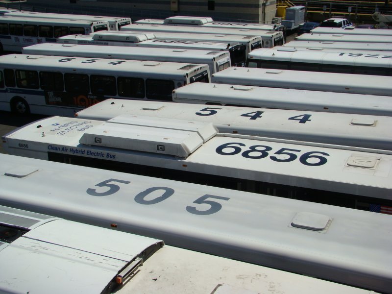 Busdepot Flushing Meadows in Queens. Aufgenommen am 14.04.08 . Hier die Dächer der Orion7 und Orion5.