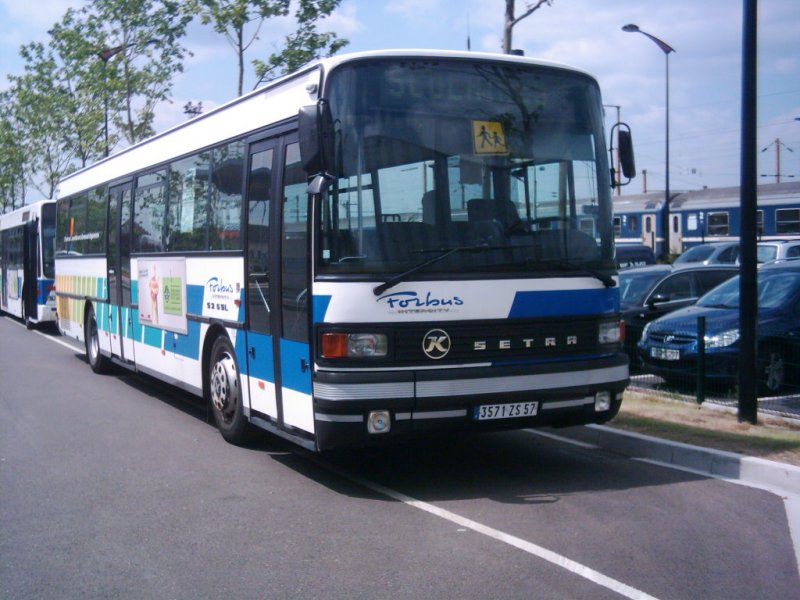 Der Verkehrsbetrieb ?Forbus Intercity? im lothringischen Forbach in dem Großraum von Saarbrücken ist ein richtiger Vertreter der Setra-Marke. Der Fuhrpark besteht aus den S 200er-, S 300er- und S 400er- Baureihen. Das Bild zeigt einen Kässbohrer-Setra S 215 SL noch im regulären Dienst.